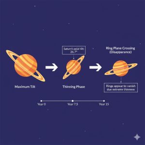 • 約15年周期: 環が「最も開いた状態」から「真横(消失)」になるまでの期間。