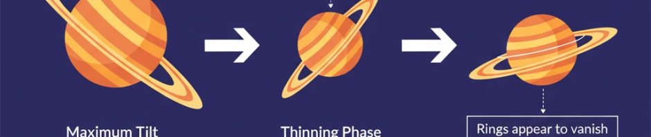 土星の自転軸は、公転面に対して 26.7度傾いています。この傾きを保ったまま太陽の周りを一周するため、地球から見ると「環を上から見下ろす時期」「真横から見る時期」「下から見上げる時期」が交互にやってきます。